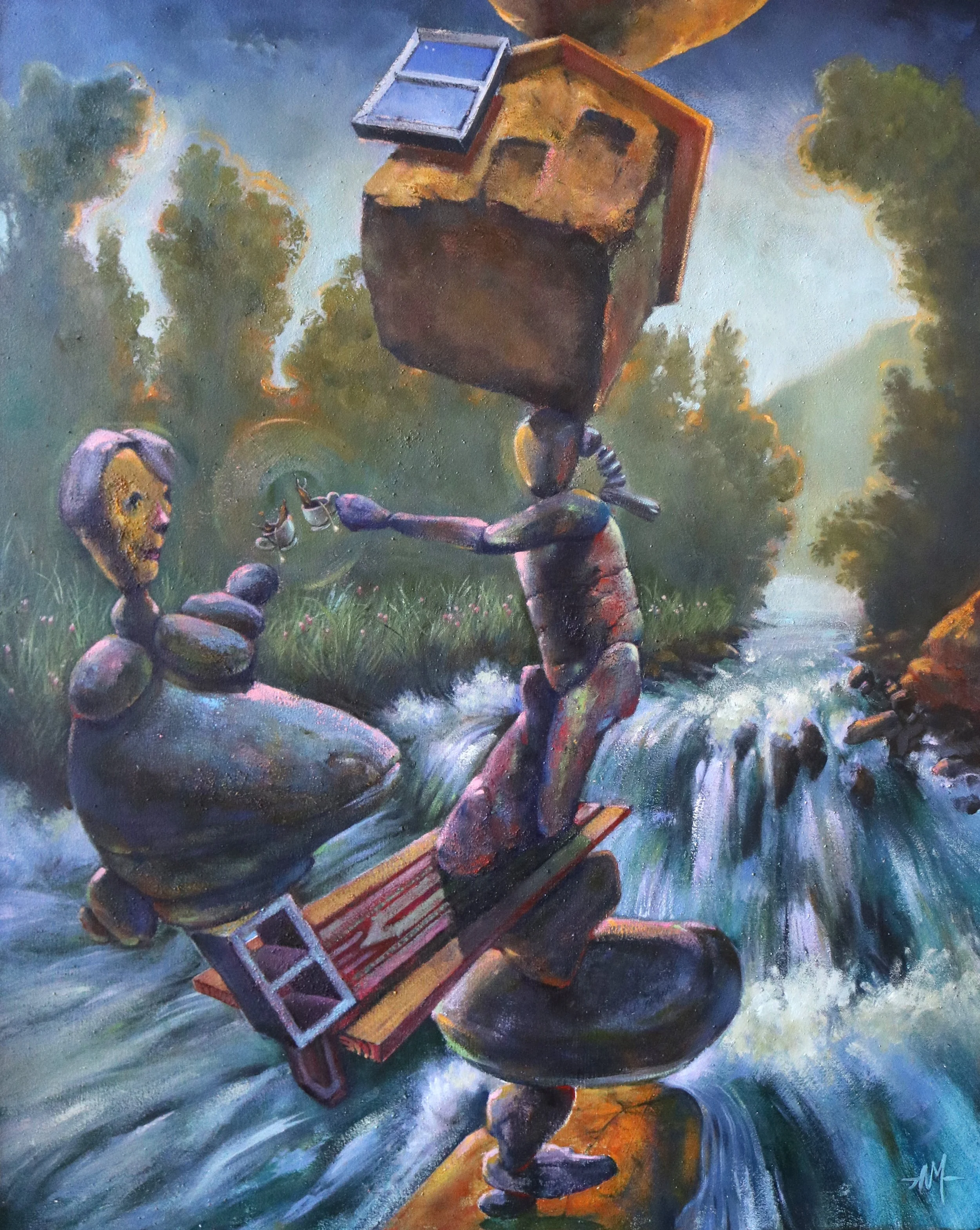 This latest series explores humanity’s often irrational and short sighted responses to the social and environmental crises we create. Using humor and an absurdist lens, these pieces underscore our collective misalignment with the natural world.